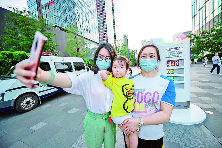 ▲6月3日,当地市民在成都太古里与大运会倒计时装置合影。