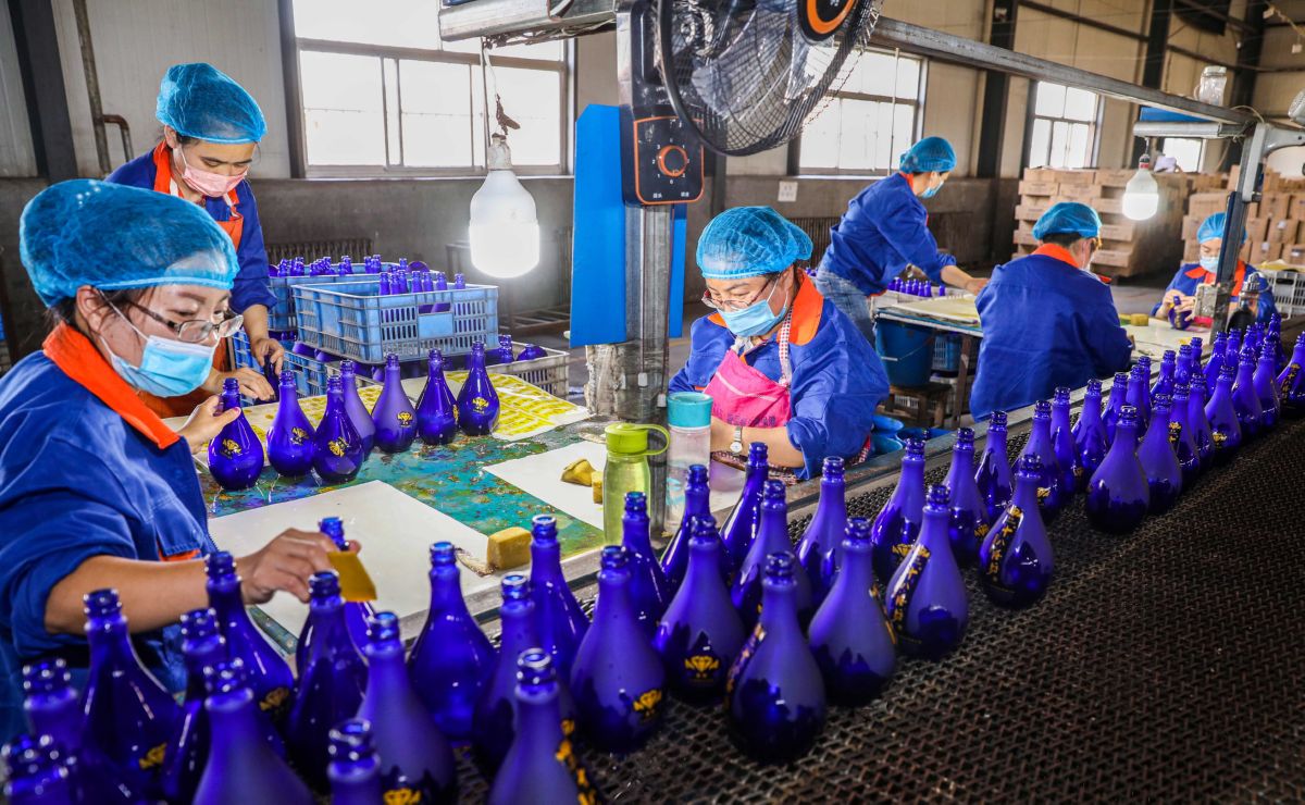 6月4日,闻喜县英发玻璃制品有限公司员工在加工酒瓶。