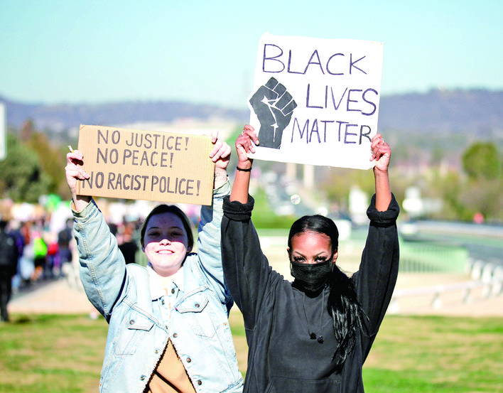 当日,澳大利亚首都堪培拉的民众举行示威活动,抗议美国明尼阿波利斯市警察暴力执法致非裔男子乔治·弗洛伊德死亡。 新华社发