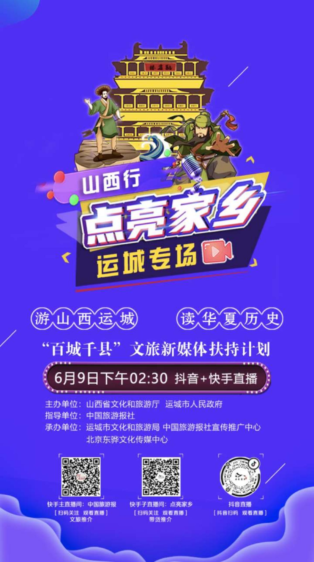 运城晚报讯(记者 王斌)6月7日从运城市文化和旅游局获悉,为深入贯彻落实“安顺诚特需愉”六字要诀要求,进一步提振文化旅游市场人气,推进疫后文旅产业复苏振兴,运城市文化和旅游局与中国旅游报社合作,将运城作为“点亮家乡·百城千县”文旅新媒体扶持计划山西行的首站,定于6月9日下午2时30分在抖音、快手上进行运城文化旅游首次线上直播活动,对运城的文化旅游进行全方位、立体化、多层次的宣传推广。