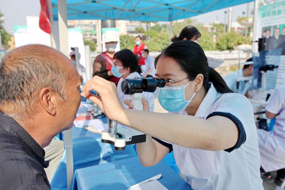 6月6日,市眼科医院医护人员在为市民检查眼睛,并为其普及眼病预防知识。