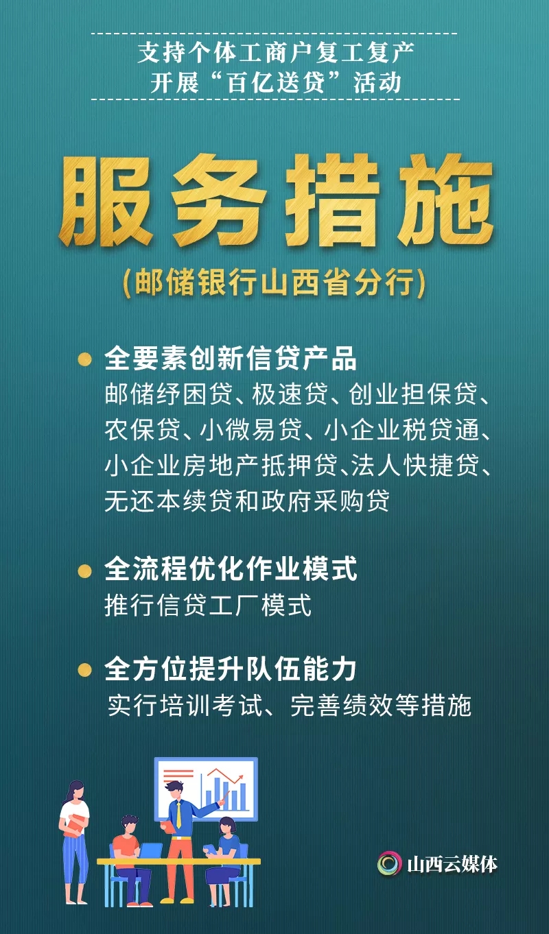 6月9日,省政府新闻办举行新闻发布会介绍,山西省市场监督管理局、中国邮政储蓄银行山西省分行联合开展的“百亿送贷”活动正式启动。活动致力于解决小微企业和个体工商户贷款难、渠道窄、门槛高、成本大的问题,力争使至少20万户小微企业和个体工商户受益。