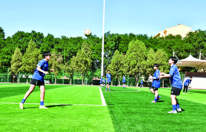 ▲6月14日,经纬中学女子足球队队员们在赛前热身。 当日,太原市晋超元老足球队与晋中市经纬中学女子足球队在山西省晋中市经纬中学进行一场友谊足球赛,享受足球带来的快乐。 新华社发