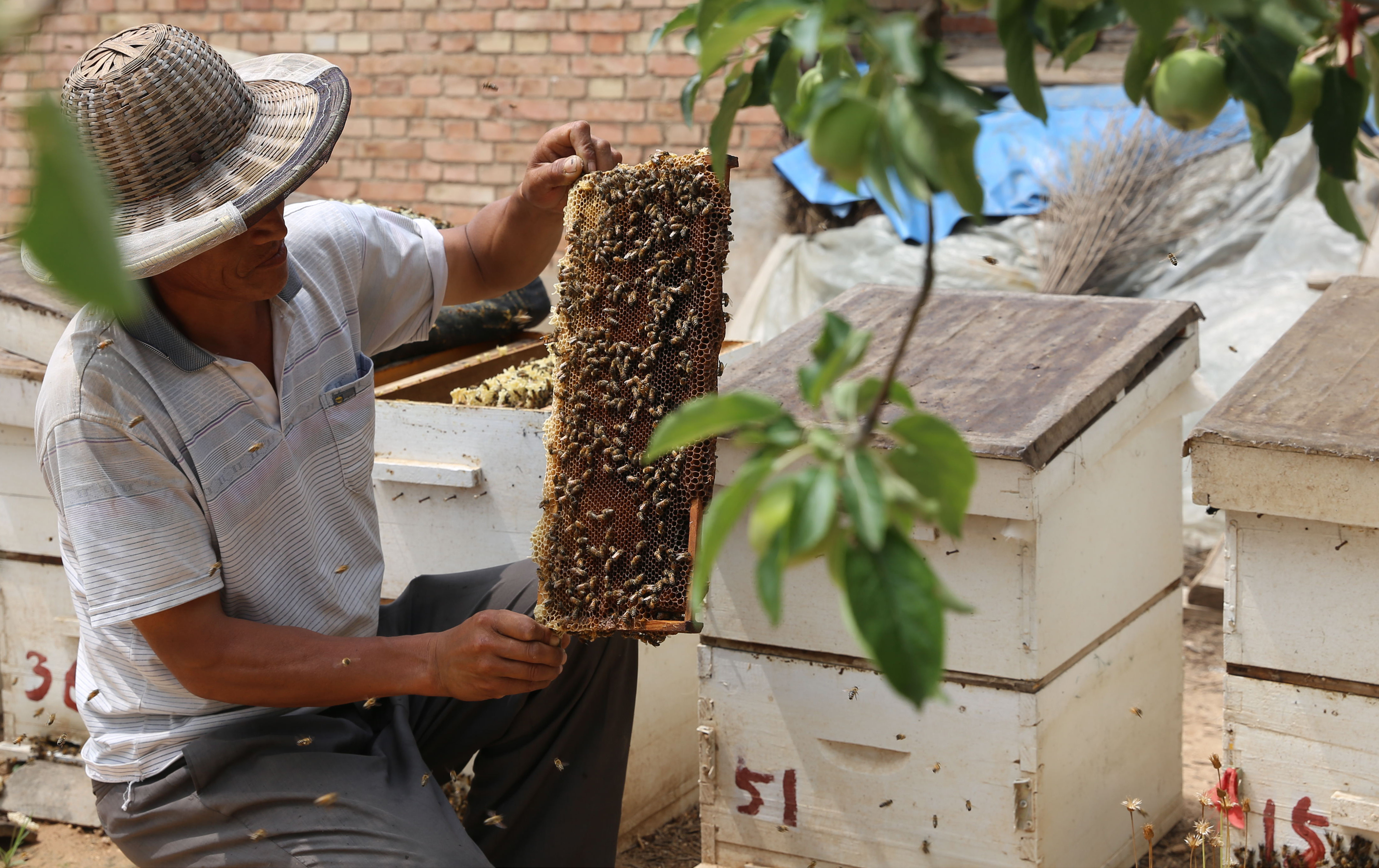 6月13日,夏县瑶峰镇李家坪村贫困户朱仲狮在观察蜜蜂采蜜情况。