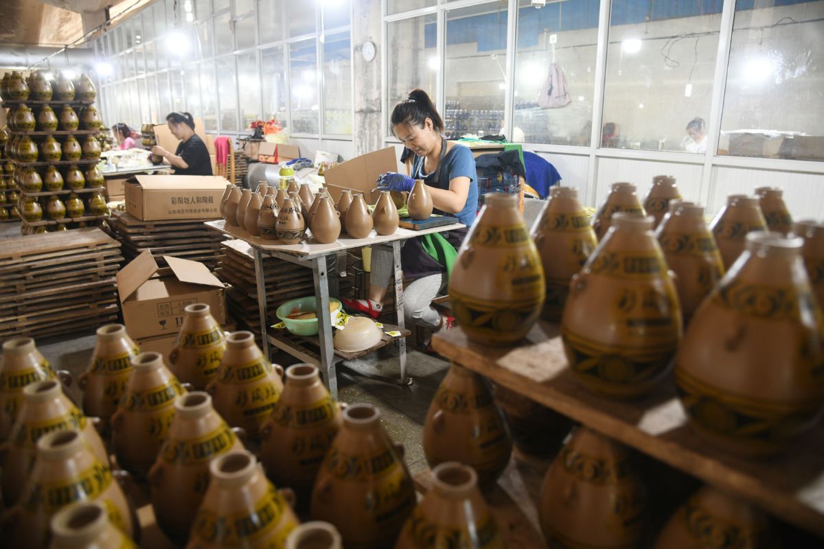 6月15日,闻喜县华隆瓷业有限责任公司员工在加工陶瓷酒瓶。