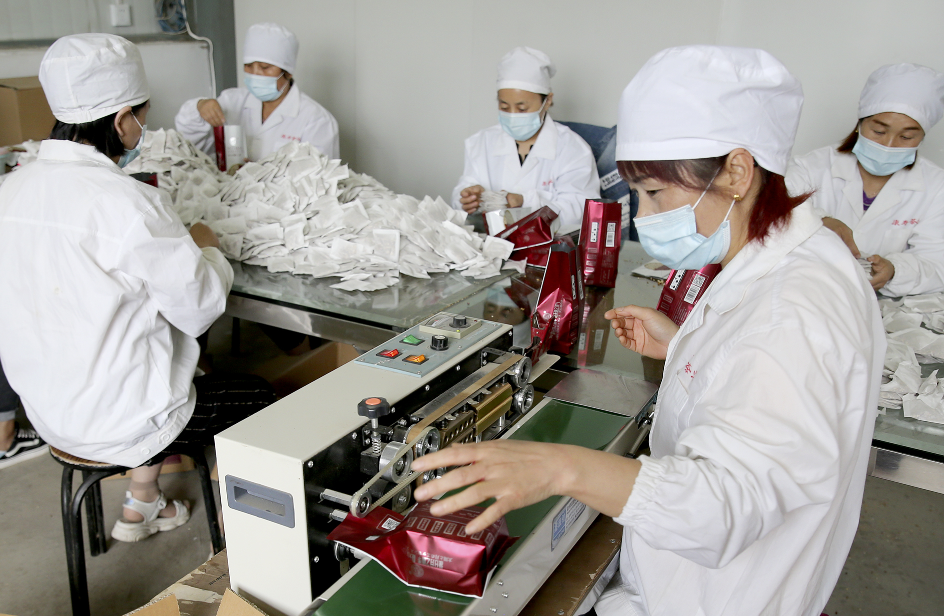 6月12日,山西康寿茶业有限公司员工在做好常态化疫情防控的同时,加紧生产“芦丁槐米茶”“金丝黄菊茶”等药茶。