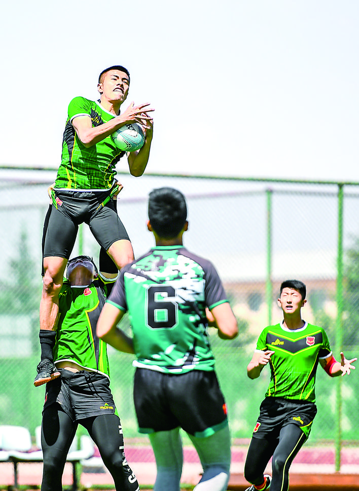 ▲6月16日,内蒙古男子橄榄球队队员周义善(上)在局部开接球抢接训练中。 近日,在做好疫情防控的前提下,内蒙古自治区橄榄球队在呼和浩特市武川县开展训练,全力备战2021年全运会等比赛。