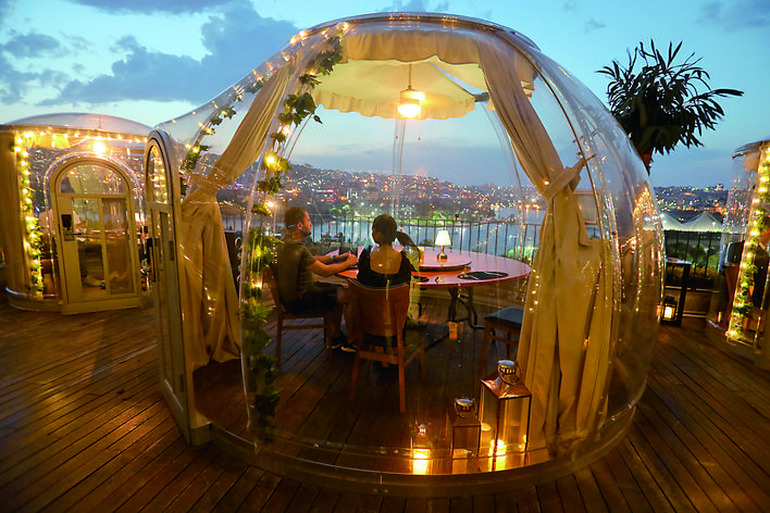 ▶6月16日,人们在土耳其伊斯坦布尔一家餐厅露台区的透明钟型就餐防护罩内用餐。 近日,位于土耳其伊斯坦布尔市区金角湾畔的一家餐厅推出透明钟型就餐防护罩,为顾客提供卫生安全保护。这些装有透明钟型就餐防护罩的餐位需要提前预约,餐厅会在顾客到来前进行彻底的消毒,餐厅还在防护罩里面放置了洗手液等设施。目前这家餐厅在露台区共安置了8个透明钟型就餐防护罩。