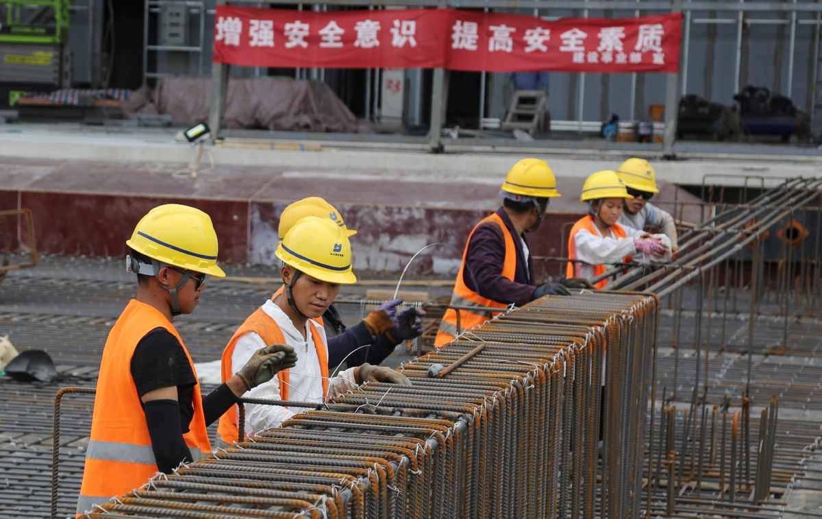 6月14日,建筑工人在运城机场扩建工地现场按程序安全施工。