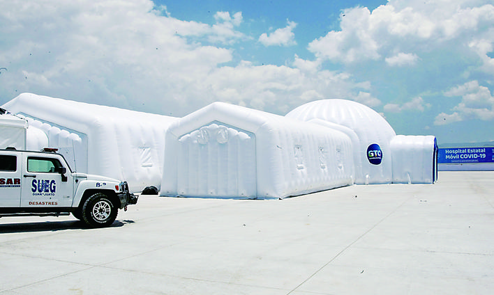 ▲6月17日拍摄的位于墨西哥莱昂市的“充气医院”。 当日,在墨西哥瓜纳华托州莱昂市,为应对新冠疫情而建设的“充气医院”正式投入使用。据当地媒体介绍,该医院占地约2500平方米,由多个分区组成,并配备空调及各种医疗设备,可同时接诊40位病人。 新华社发