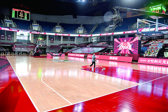 ▲2019~2020赛季中国男子篮球职业联赛(CBA)将于6月20日复赛,会以赛会制空场比赛的方式在青岛与东莞两个赛区展开。青岛赛区作为承办复赛第一阶段的两大赛区之一,将有10支球队进行39场比赛。目前,承办青岛赛区的青岛国信体育馆已进行了场馆内部的升级改造。 图为6月18日,一名保洁人员在青岛国信体育馆内清洁地板。