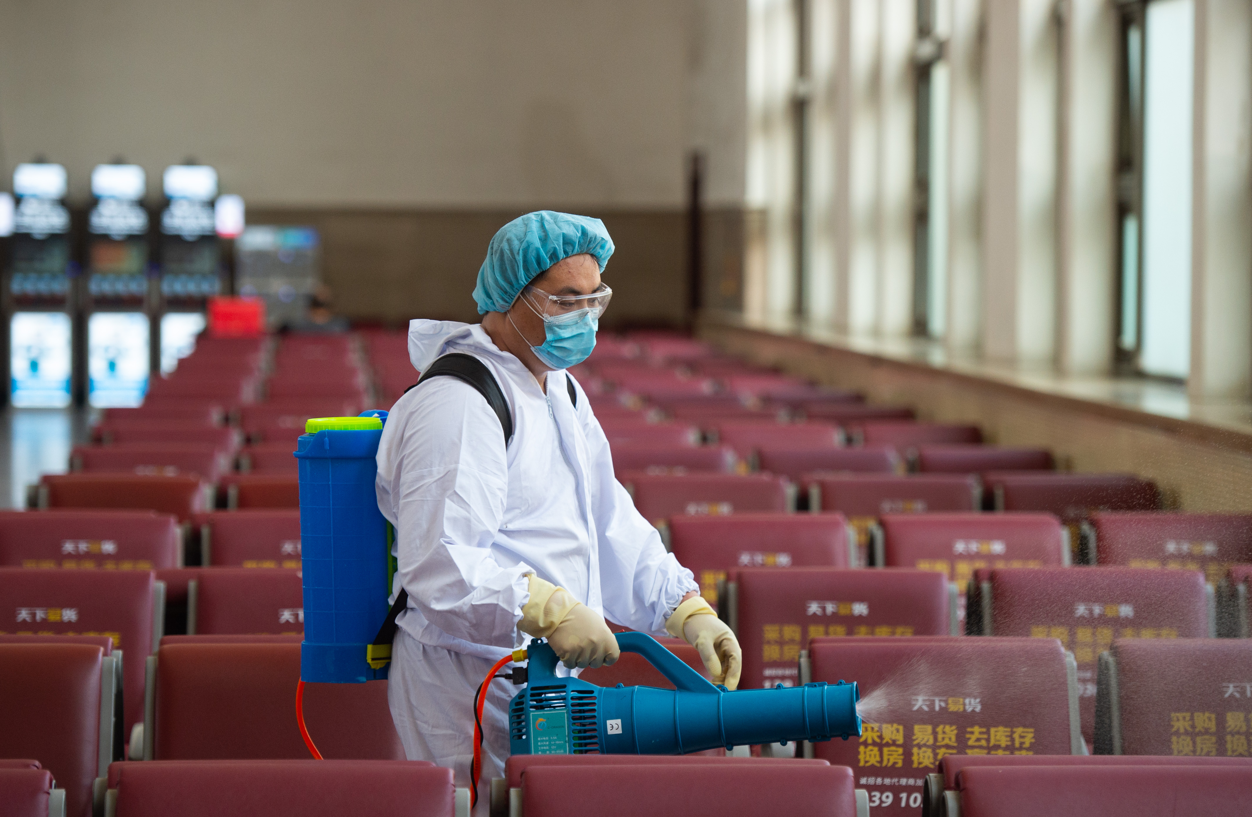 6月18日,北京站工作人员在候车室进行消杀工作。 自6月16日北京市突发公共卫生应急响应级别由三级调至二级后,北京站加大防控力度,加强消杀、测温等工作,并根据客流情况,动态调整列车开行对数。新华社发