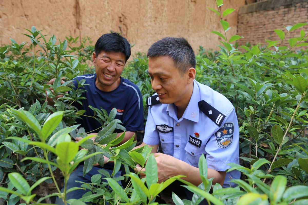 6月16日,夏县公安局民警王玉峰与瑶峰镇石泉沟村帮扶对象张永军观察新培育的抗寒桂花长势。