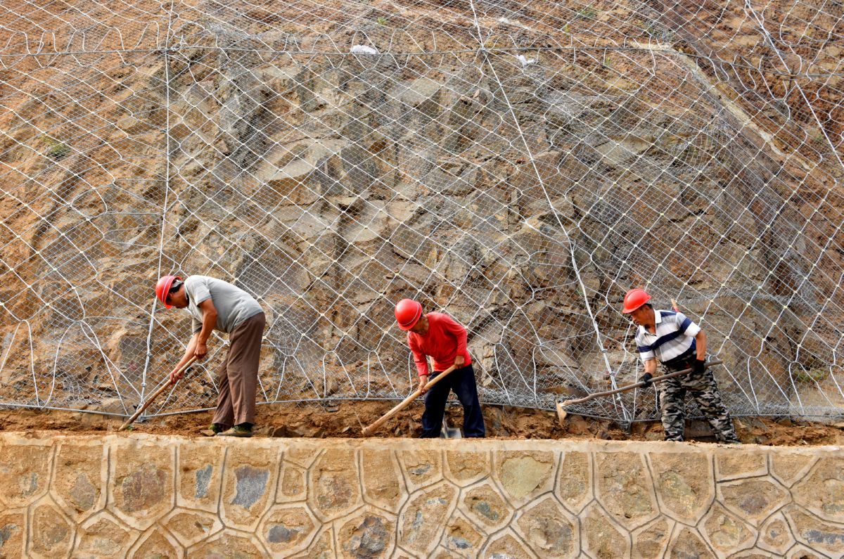 6月14日,施工人员在垣曲县新望旅游公路山坡上加装护坡网。