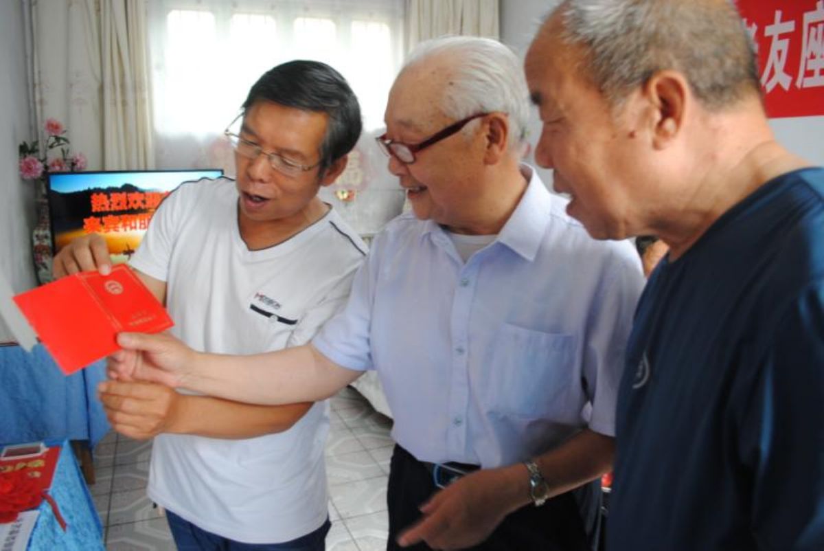 ▲王仲熊老人(右二)与老朋友分享自己的经历