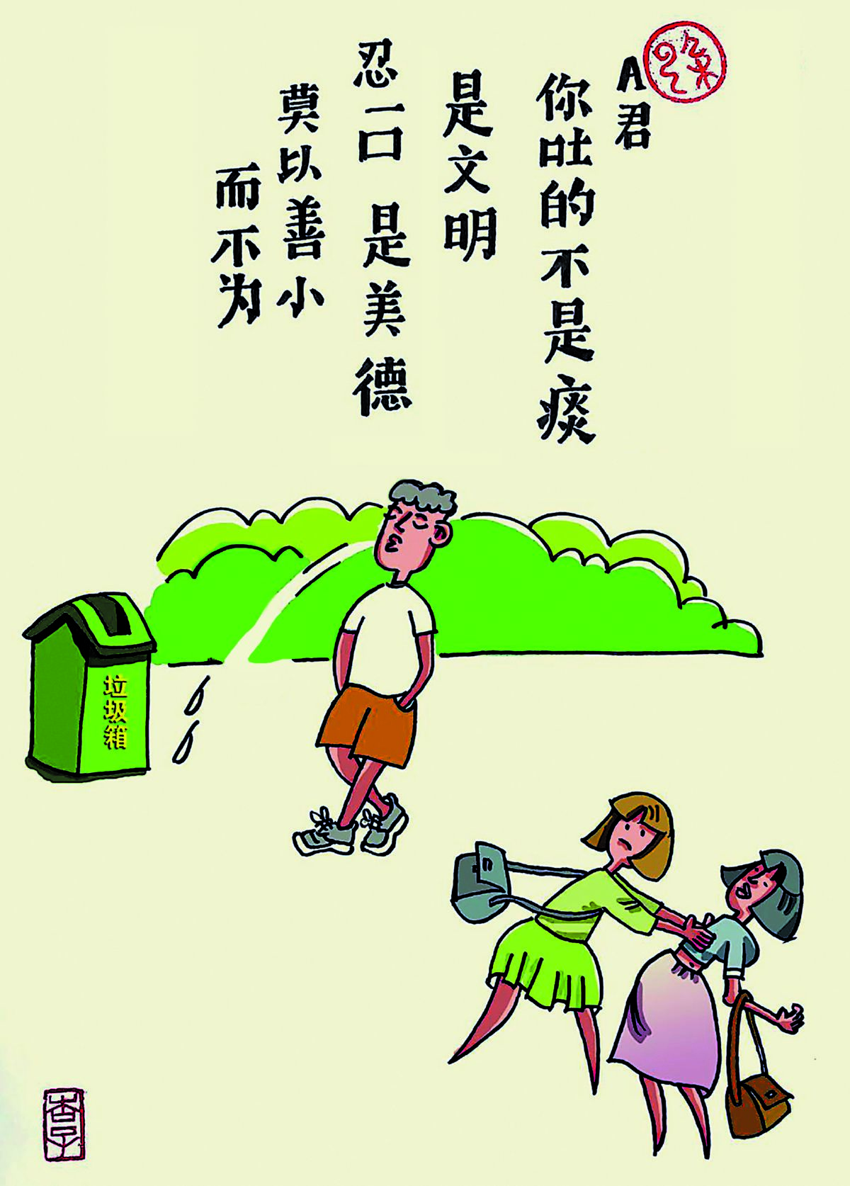 近年来,我市城市面貌发生很大变化,以更加整洁和美丽的形象示人。但在我们身边仍然有一些不文明行为,让城市的美好形象打了“折扣”,其中就有随地吐痰。这不仅是一些市民自身文明素质缺失的体现,而且在某种程度上折射出城市的文明程度。