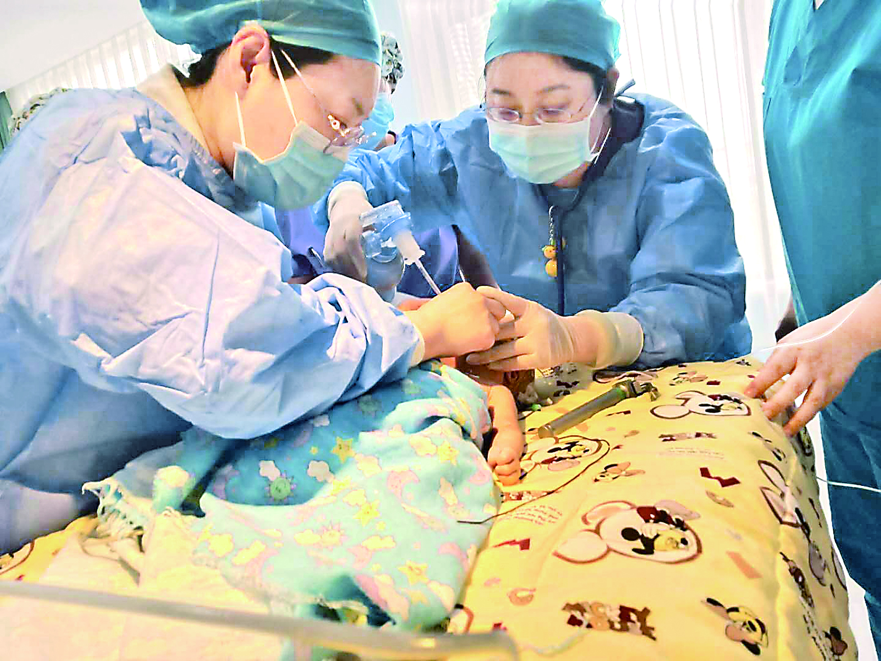 市中心医院新生儿科主任赵旭晶(中)在转运新生儿时,为其进行气管插管。