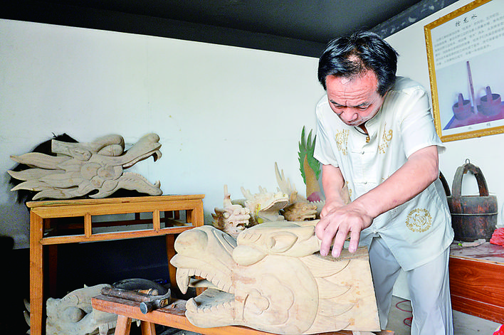 ▲许桂生在雕刻龙舟的“龙头” 新华社发