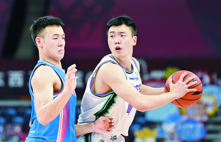 ▲6月29日,山东西王队球员张辉(右)在比赛中伺机传球。 当日,在2019-2020赛季中国男子篮球职业联赛(CBA)复赛第一阶段比赛中,山东西王队以95比77胜四川五粮金樽队。