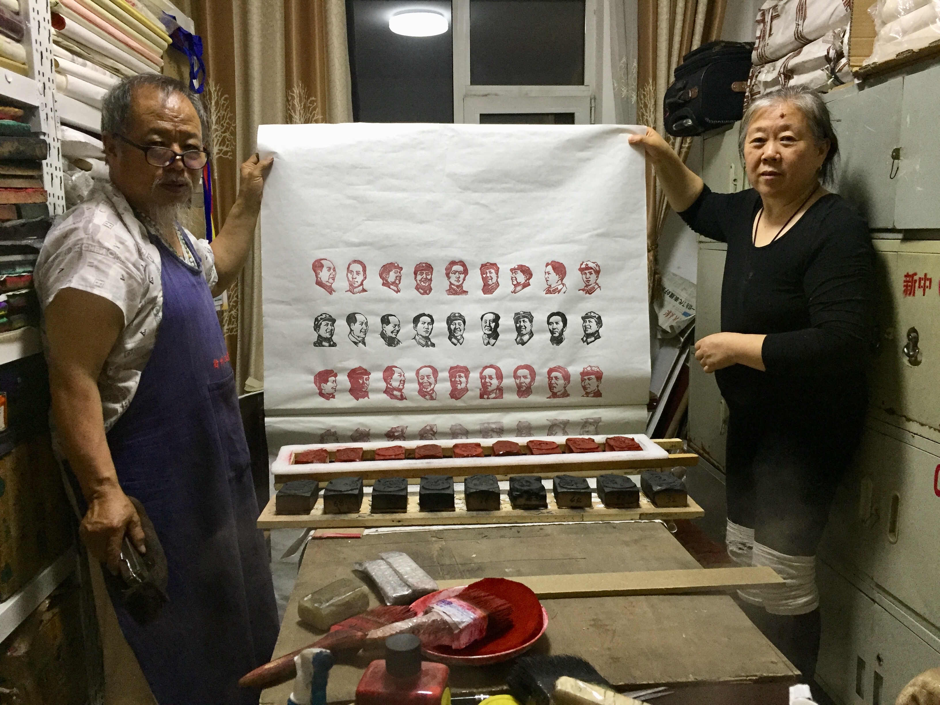 在中国共产党诞辰99周年之际,山西绛州木版年画非遗传承人吴百锁和家人,精选100枚毛主席像章,精心制作了《毛泽东主席百幅肖像组图》,歌颂中国共产党为新中国建立而立下的丰功伟绩,缅怀毛泽东等老一辈革命家为新中国诞生抛头颅洒热血的历史篇章。“身为一名老党员,我愿以自己所长庆祝中国共产党建党99周年。”怀着对党的一片赤诚,吴百锁说。本报记者 苏黎原 摄