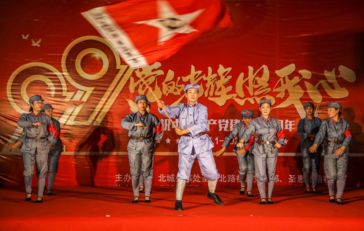 为庆祝中国共产党建党99周年,在北城街道党工委的指导下,圣惠北路社区组织30余名党员群众精心编排节目,为社区居民送去小合唱、诗朗诵、京剧选段、红歌联唱等多种形式的精彩表演,赢得现场观众阵阵掌声。