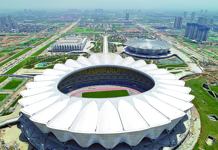 ▲7月1日,第十四届全运会主场馆西安奥体中心“一场两馆”全面竣工交付。第十四届全国运动会将于2021年在陕西举行。 图为6月30日拍摄的西安奥体中心“一场两馆”(无人机照片)。