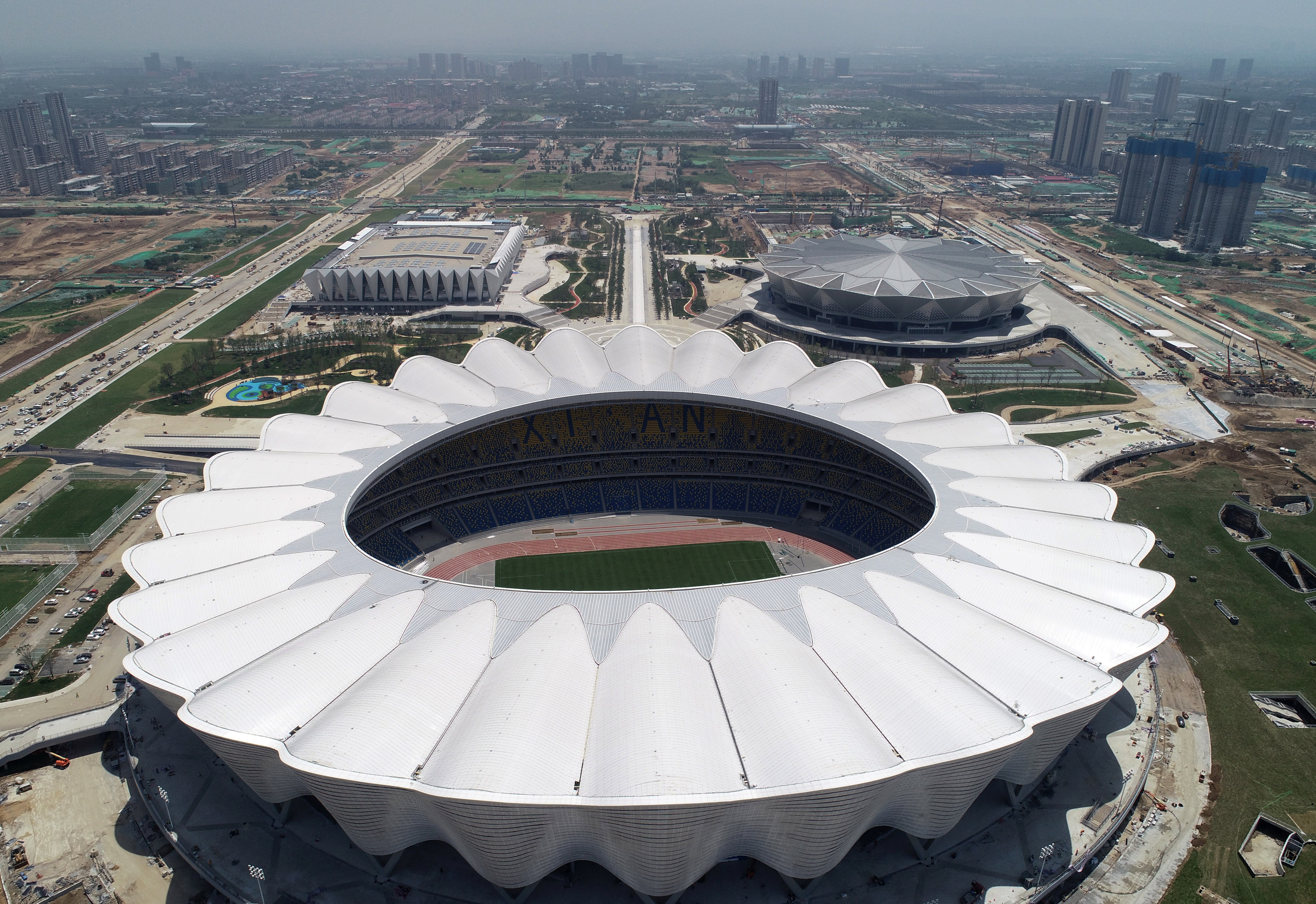 7月1日,第十四届全运会主场馆西安奥体中心“一场两馆”全面竣工交付。第十四届全国运动会将于2021年在陕西举行。 图为6月30日拍摄的西安奥体中心“一场两馆”(无人机照片)。(新华社7.1)
