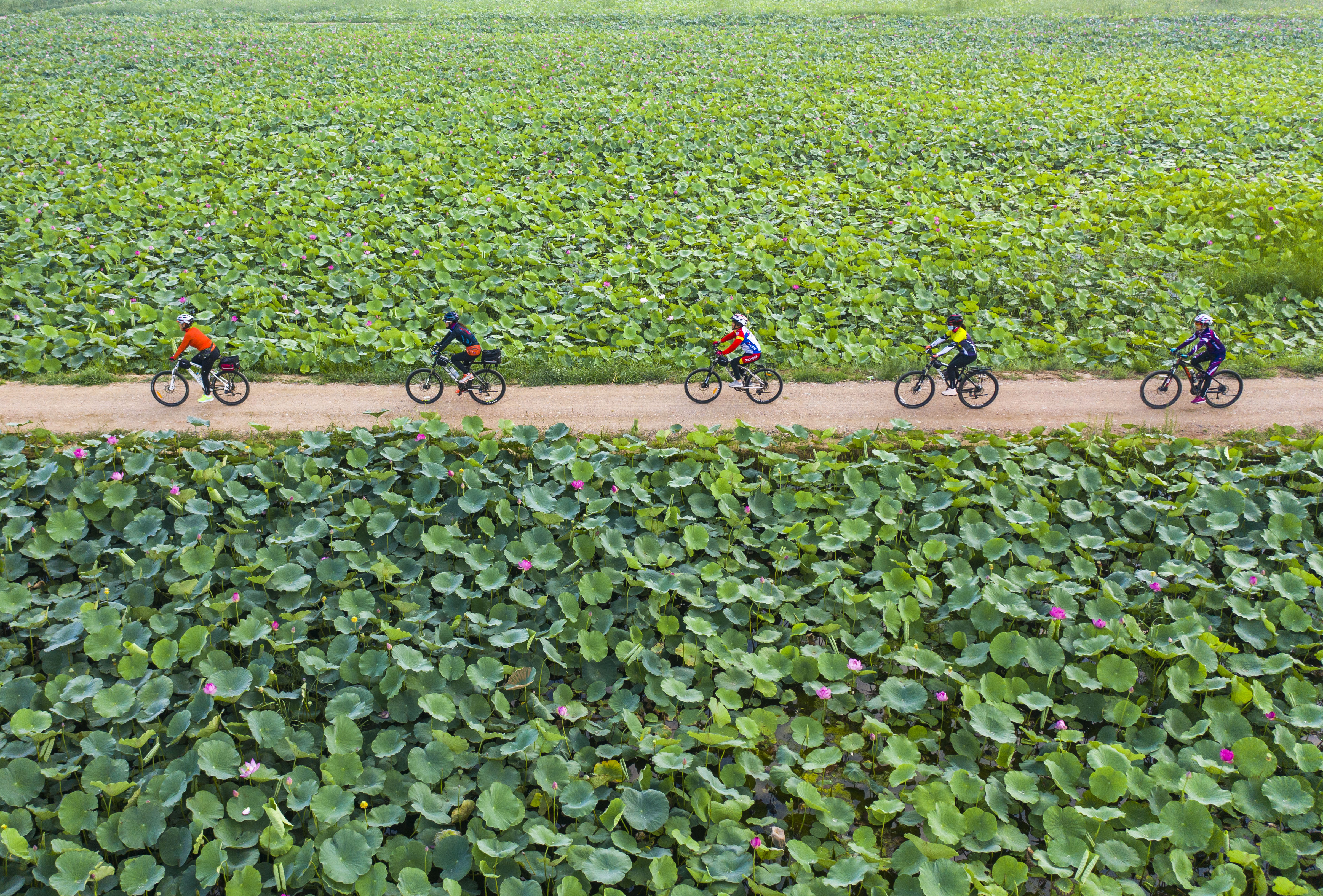 7月2日,稷山县自行车运动协会骑友在汾河国家湿地公园骑行。