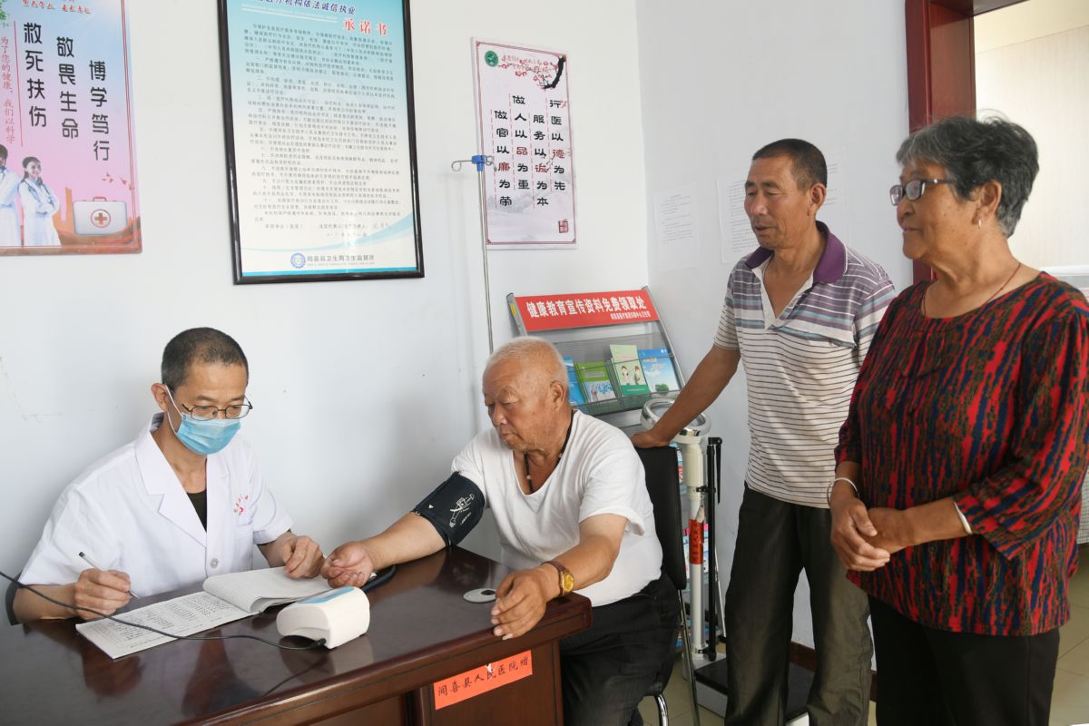 6月28日,闻喜县东镇东干庆村卫生室医务人员在为村民检查身体,宣传解答夏季预防各种疾病健康知识。东干庆村卫生室设有观察室、治疗室、药房,可以满足本村村民的基本医疗服务。