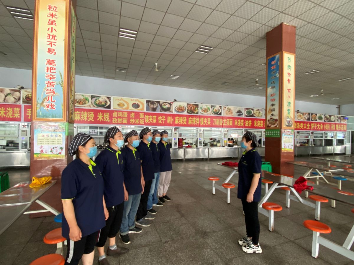 ▲连日来,作为高考考点的盐化中学积极做好常态化防疫下的高考准备工作。对防控物资分类储备和安全使用、考场的制冷设备检修更新、大门口的临时隔离室设置、监控设备的良好运行、餐厅的食品安全等各项工作做实做细,服务广大考生。图为对餐厅人员进行培训。 记者 李宏伟 摄