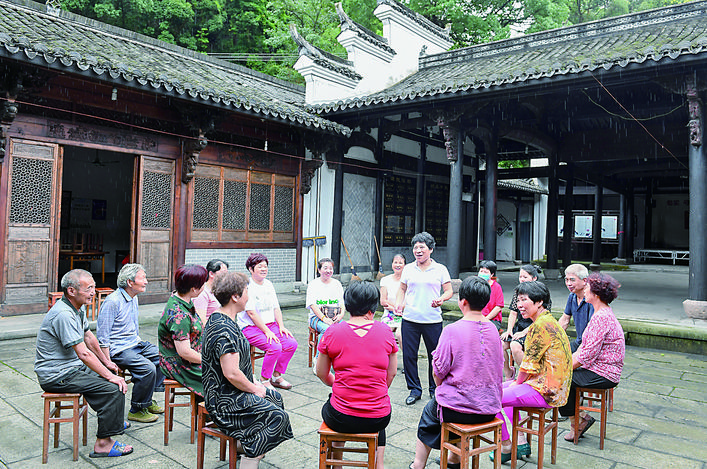 ◀7月2日,社区妇女主任在岭北镇金山湖村的“板凳课堂”上推广公筷公勺用餐。 位于偏远山区的浙江诸暨岭北镇自2018年探索开设“板凳课堂”,从党员干部、农技专家中选出宣讲员,用通俗易懂的语言对山区群众进行知识普及、政策宣传。“板凳课堂”每年开展百余场活动,有力推动了党的理论政策宣传和移风易俗工作的开展。