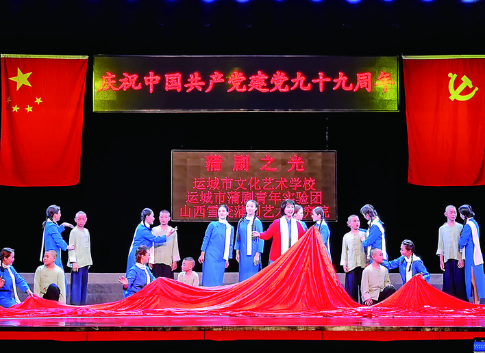 镰锤凯歌奏响,蒲韵声声铿锵。在党的99岁华诞来临之际,6月30日晚,运城市文化艺术学校、市蒲剧青年实验演出团、山西雪变蒲剧艺术研究院,联合推出《蒲剧之光》庆“七一”红色经典专场演出。艺术家们用精彩的表演,带领广大戏迷重温那段峥嵘岁月,深切感受革命先辈的崇高精神,共庆党的生日。