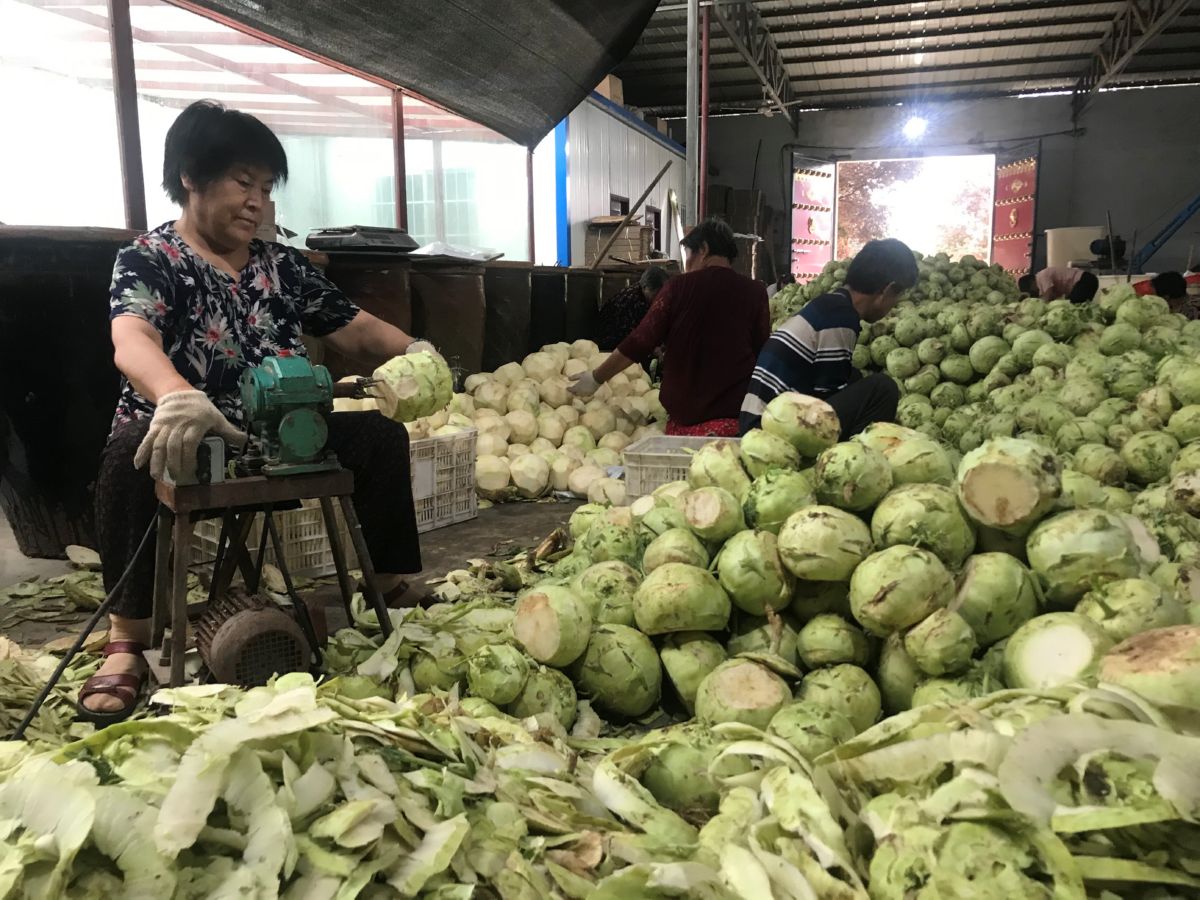 6月22日,在盐湖区泓芝驿镇寨头村的山西恒老久农副产品加工有限公司,66岁的景凤琴和几名村民一起加工苤蓝,准备腌制酱菜。