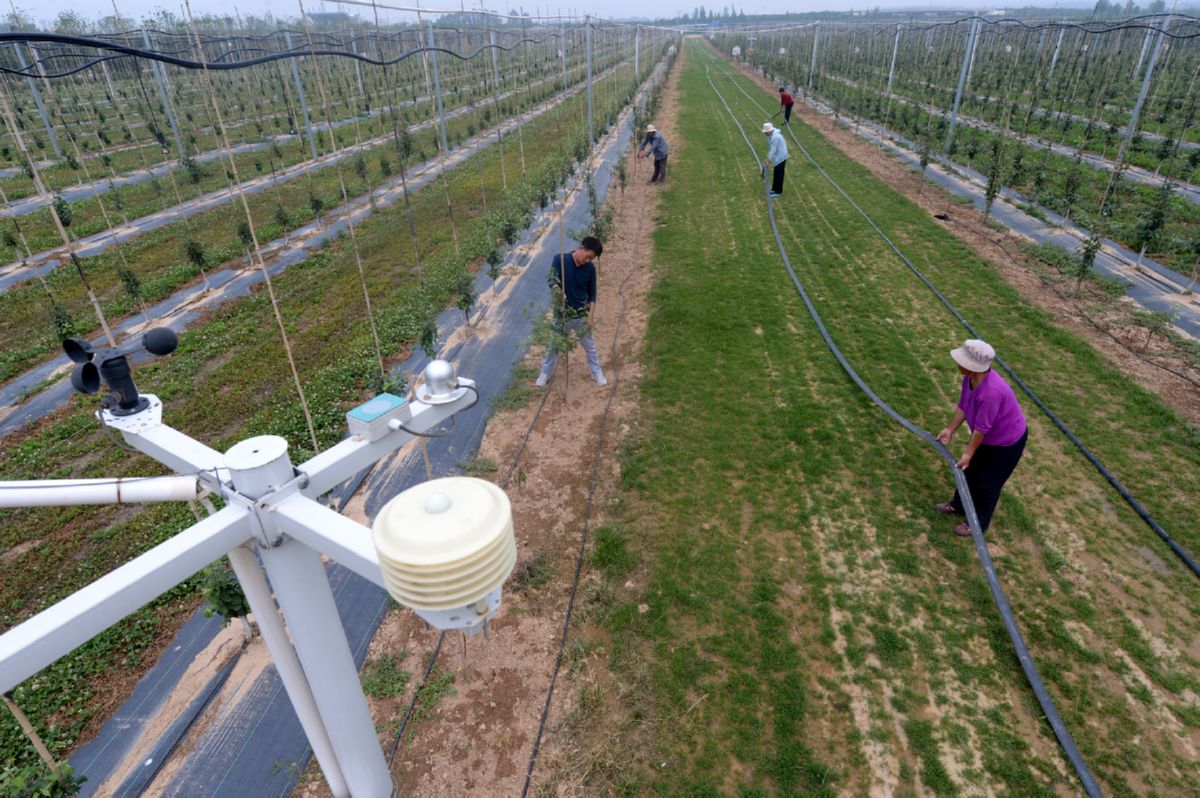 7月2日,位于万荣县高村乡闫景村的现代果业科技创新服务中心推广示范基地,技术人员在铺设喷管。