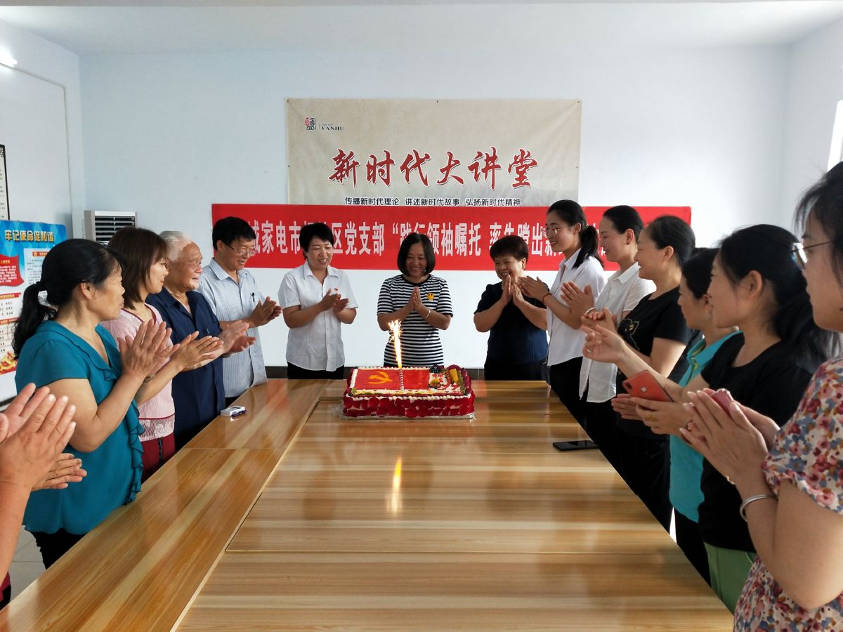运城晚报讯(记者 冯杨婕)7月1日,盐湖区中城办家电市场社区党支部成员和居民聚在一起唱国歌、重温入党誓词、诵读党章、研学新思想、听党课、观专题片,大家一起吃蛋糕,集体庆党生日。