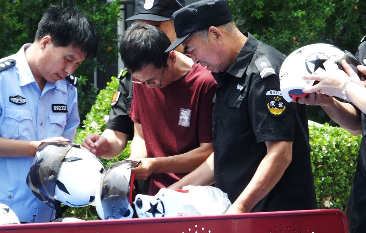 7月3日,新绛交警大队民警在辖区天府苑小区,为群众讲解如何正确佩戴安全头盔。