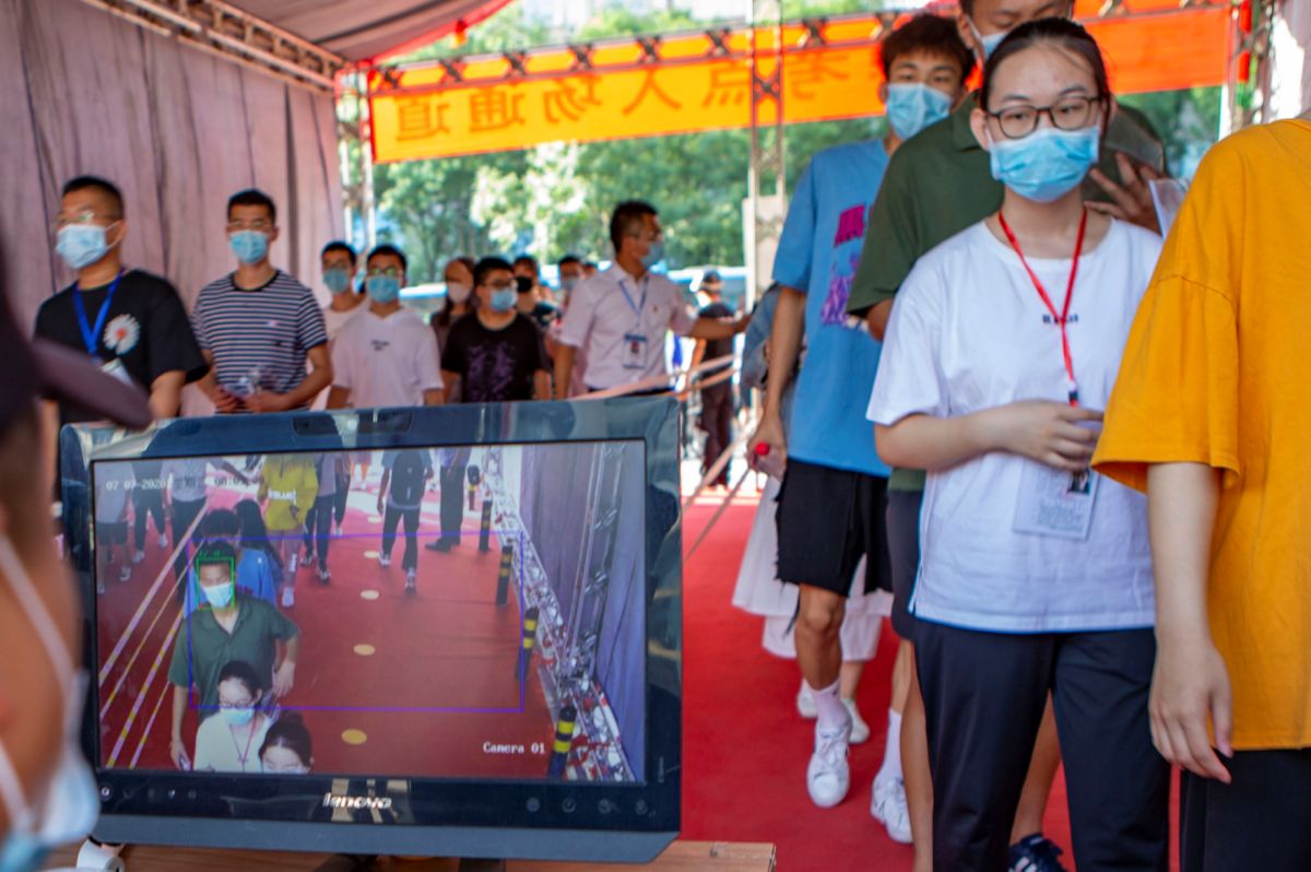 7月7日,在市区运城中学考点,考生接受人脸识别系统体温测量后,有序进入考场。 特约摄影 尚建周