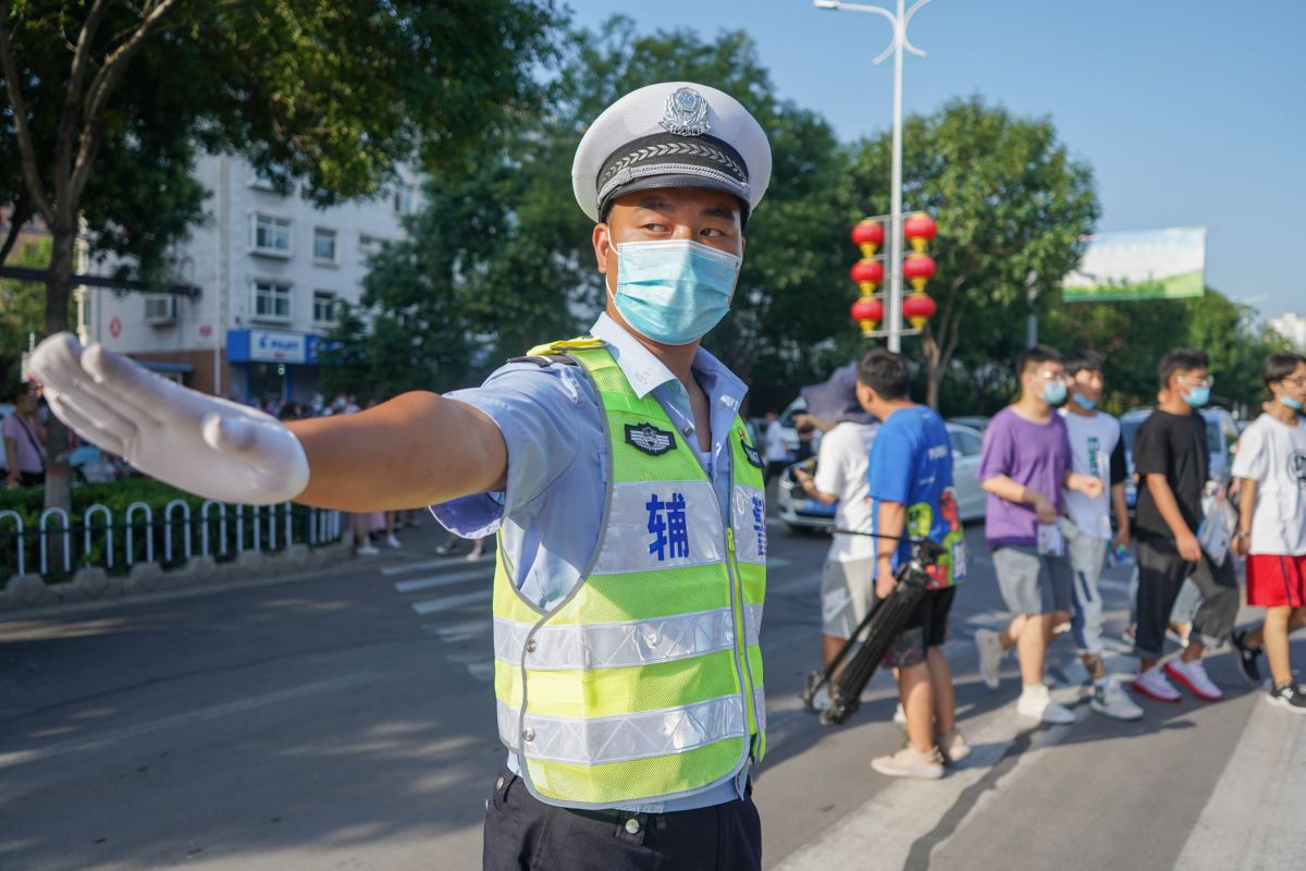 ▲民警示意过往车辆停车礼让考生 李政奇 摄