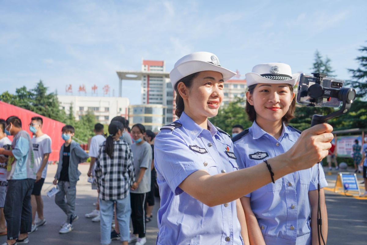 ▲民警在运城中学考点前直播交通情况 李政奇 摄