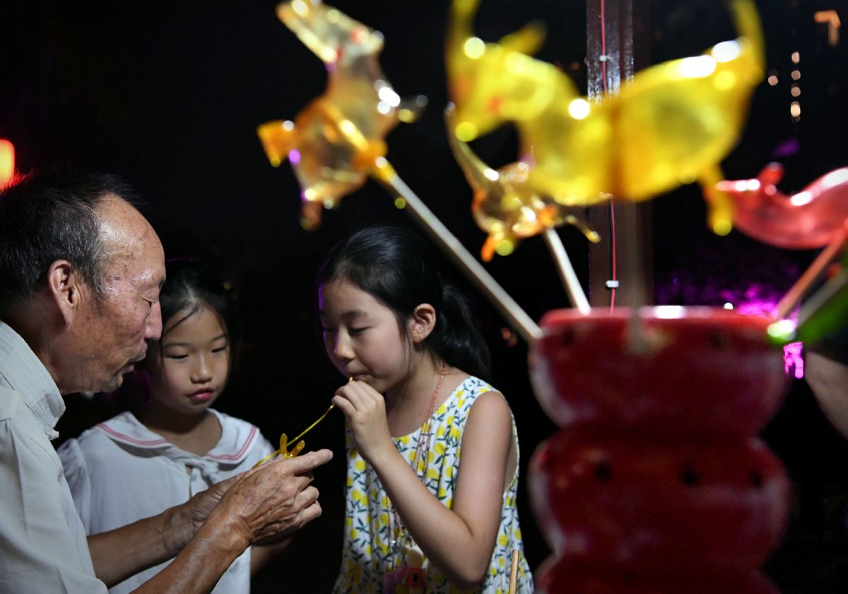 ▲7月7日晚,小朋友在洛阳洛邑古城内吹糖人。