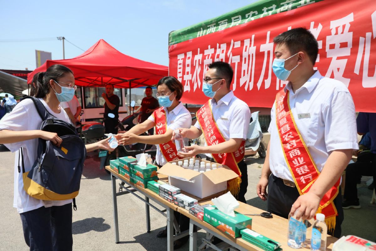 ▲7月7日,夏县农商银行志愿者为考生发放爱心物品。