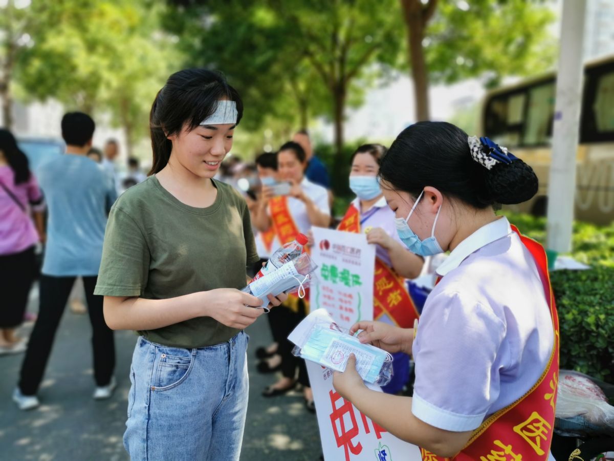 ▲7月7日,在运城力行中学门口,华强百汇医药公司的爱心护考志愿者,为考生发放口罩。