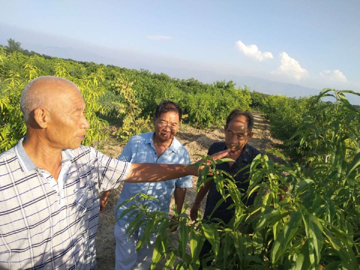 ▲7月7日,中农乐农业科技股份有限公司技术人员王万魁、赵强、范新中等,冒着酷暑,深入盐湖区车盘办事处西高玉村、北贾村,对桃农进行田间指导。