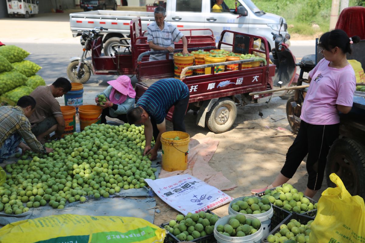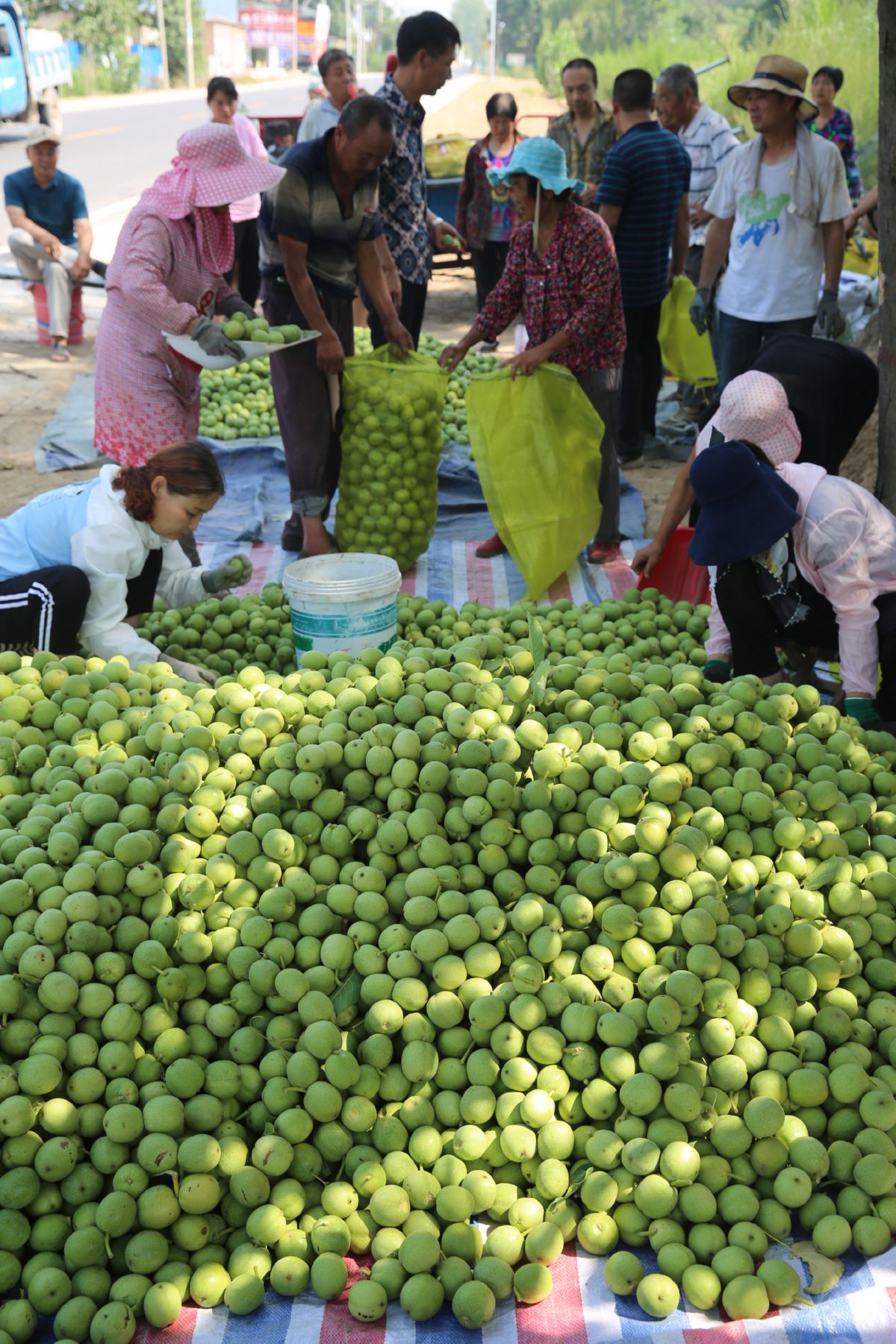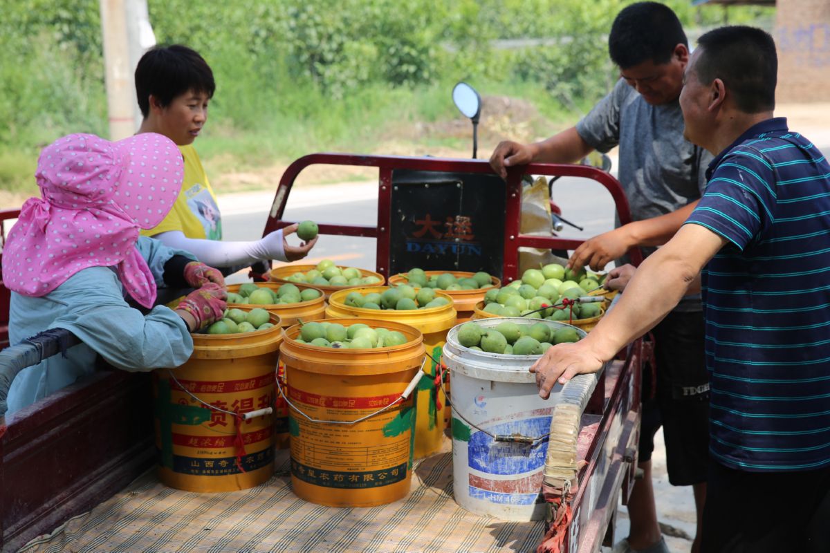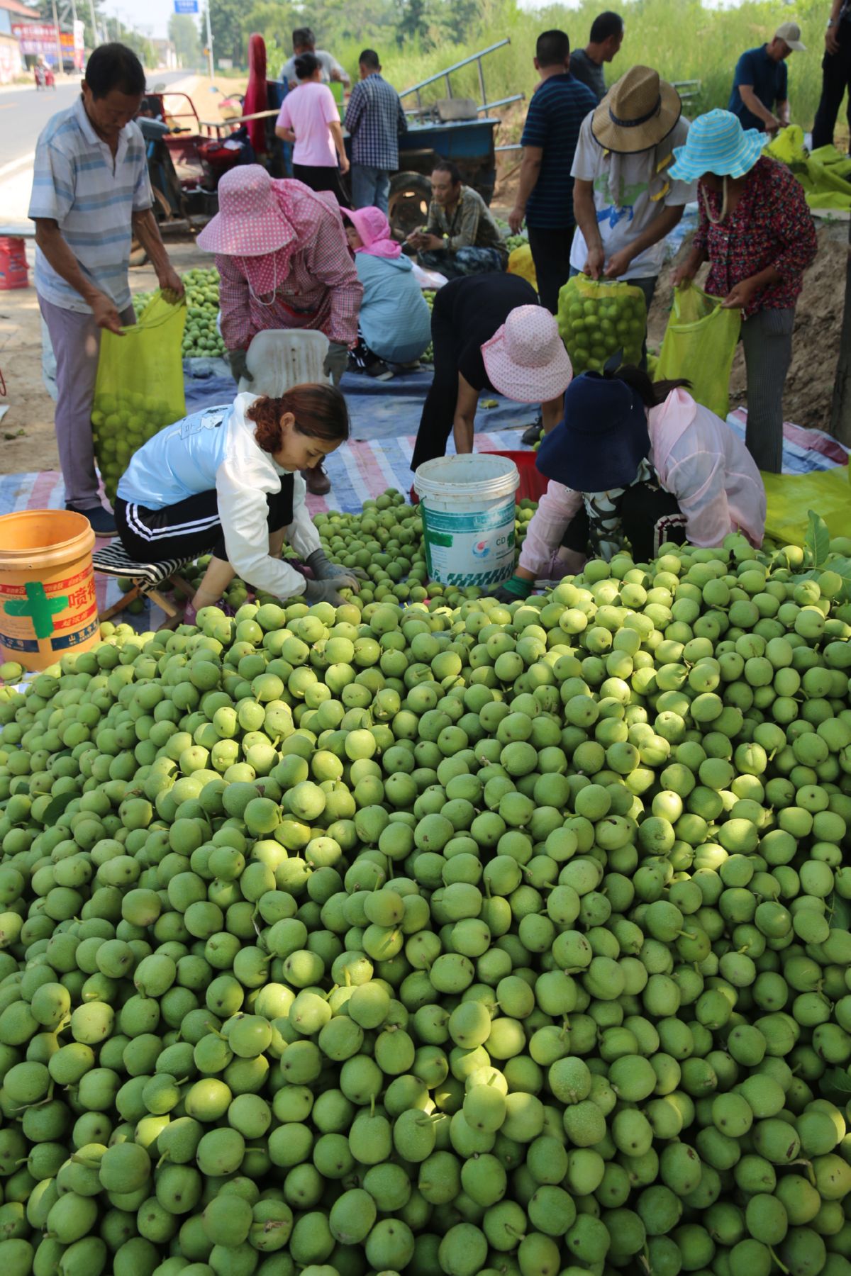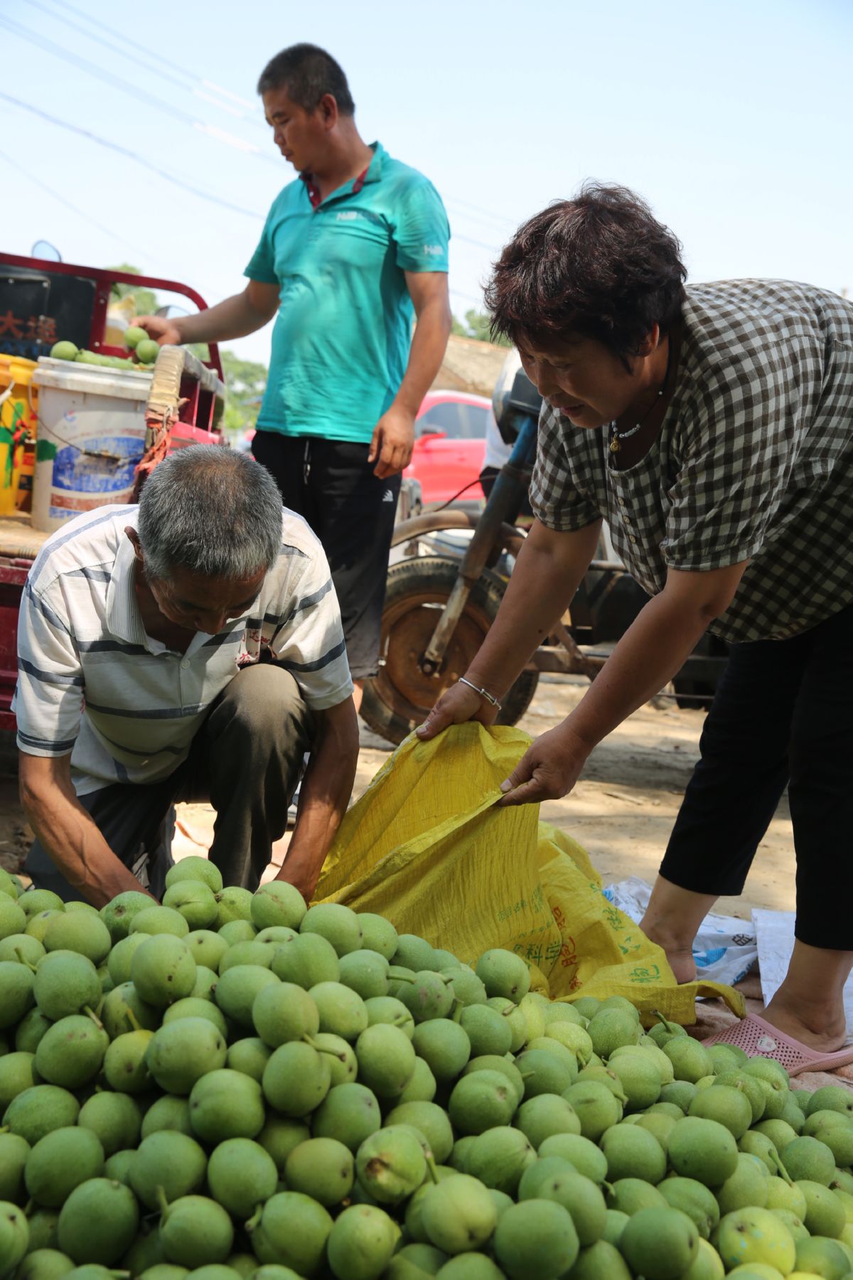 7月7日,永济市蒲州镇北阎郭村,村民们冒着38℃高温天气的酷热,将刚刚采摘回来的“鲁光”青皮核桃,进行分级、整理和装袋作业,以尽快外运销售。