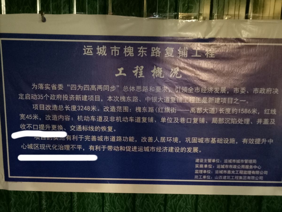 ▲7月7日晚,记者在市区河东街与槐东路交会处的“运城市槐东路复铺工程”公告上,看到有两处语句不通。