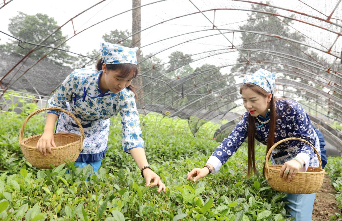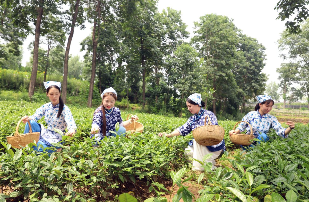 ▲7月4日,位于夏县泗交的厚民晋茶茶园里,四名女员工在采摘新茶。