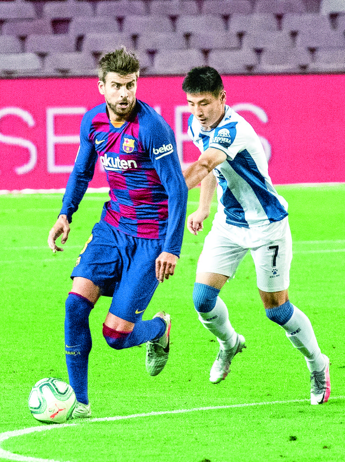 ▲7月8日,西班牙人队球员武磊(右)在比赛中防守巴塞罗那队球员皮克。 当日,在2019~2020赛季西班牙足球甲级联赛第35轮比赛中,西班牙人队客场以0比1不敌巴塞罗那队,提前三轮降入乙级联赛。 新华社发