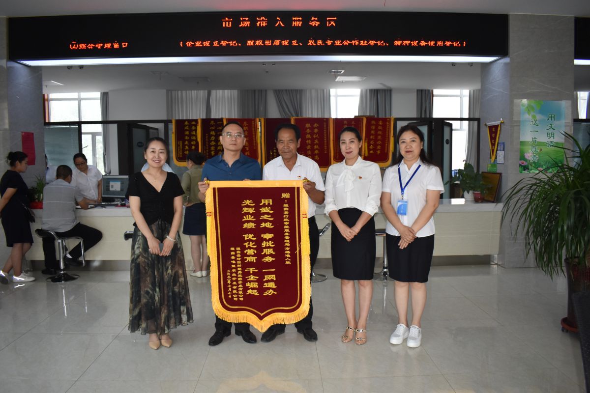 运城晚报讯 “没想到短短几个小时我们就拿到了营业执照,非常感谢你们主动为我们提供贴心服务,助推我村经济发展。”垣曲县人大代表、岭回村迎舜旅游开发有限公司负责人常仁科高兴地说。7月8日下午,垣曲县岭回村迎舜旅游开发有限公司、垣曲县唯益农业开发有限公司将一面写有“用武之地 审批服务 一网通办 光辉业绩 优化营商 千企崛起”的锦旗送到该县行政审批服务管理局市场准入窗口(右图),向提供快捷高效审批的工作人员表达谢意。