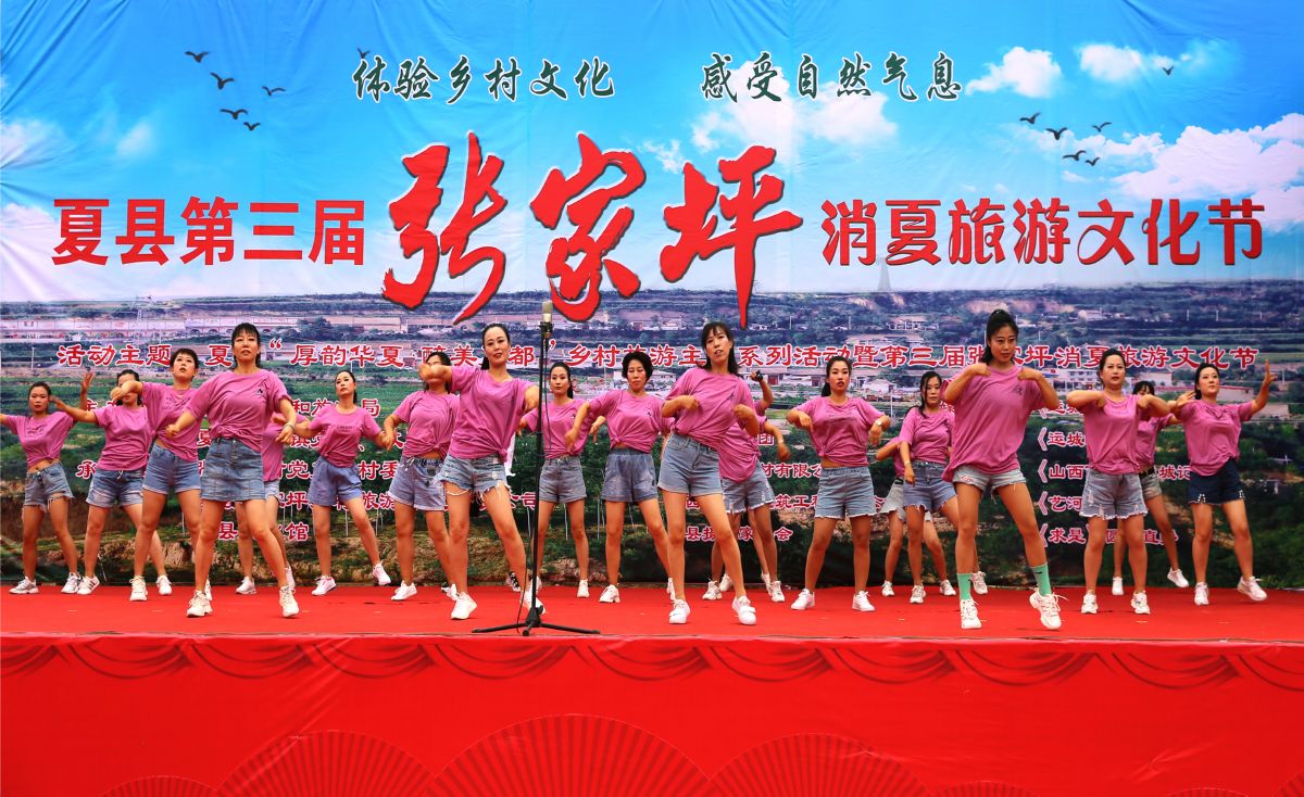 7月10日,演员们在夏县第三届张家坪消夏旅游文化节现场表演舞蹈。