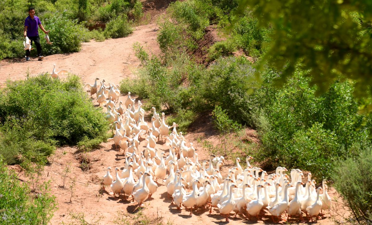7月12日,垣曲县古城镇三联村养殖户普战朋在赶肉鹅进入水塘。
